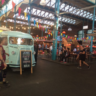 Am Morgen holte David netterweise leckere Teilchen vom Bäcker und wir frühstückten zu Hause. Mittags sind wir dann zum Badeschiff an der Spree gefahren. Das Badeschiff ist ein "Flussschwimmbad", welches ich so in der Art noch nie gesehen habe: Der Steg über der Spree führt zu einem großen Swimmingpool, der ebenfalls in der Spree liegt und sehr kaltes Wasser beinhaltet. Von dort aus hat man ein wunderbares Panoramablick auf die Spree, die Oberbaumbrücke und den Fernsehturm. Der Eintritt kostet nur 5,50€, was echt günstig ist, dafür dass man dort auch eine Sonnenliege bekommt ( falls man nicht zu spät ist und alle Liegen belegt sind!) und den Tag dort in der Sonne genießen kann. Auf dem Gelände mit Sand befindet sich eine Bar, wo es relativ teure Getränke, Eis und Burger gibt. Die Schließfächer sind auch nur begrenzt vorhanden, sodass man dort am Besten so früh wie möglich vor dem Mittag auftaucht. Wir hatten aber noch Glück und hatten das allerletzte Schließfach bekommen. Nach einem langen Nachmittag voller Sonne und gebräunter Haut, bekamen wir so langsam Hunger und gingen zur Markthalle Neun, die sich sehr nah am Badeschiff befand. Dort gibt es einen Wochenmarkt sowie jeden Donnerstag auch Streetfood und das wieder kostenlos! Das ist das gute an Berlin, dass es einfach so viel preisgünstiger ist als in Köln, gerade bei so Veranstaltungen. Wir fanden direkt mehrere Foodtrucks und Stände, die uns sehr angesprochen hatten: Zu Beginn hatten wir von einer italienischen Bäckerei in der Markthalle zwei Stücke Foacaccia (italienisches Fladenbrot aus Hefeteig) gegessen: Eins mit Tomate/Mozarella und eins mit Kartoffeln drauf, welches in der Mikrowelle erwärmt wurde. Lecker war's! und weil das nicht genug war, haben wir uns noch umgeschaut und zwischen lauter Ständen mit Asiatischer, Mexikanischer, Chinesischer, Deutscher und Israelischer Küche auch noch einen Food Truck gefunden, der indische Wraps mit leckerem Käse gefüllt ,verkauft hat! Da mussten wir zuschlagen und wiederum waren wir begeistert! Wir teilten uns meist das Essen um so mehr probieren zu können ;) Danach gab es noch als Nachtisch einen Kuchen für mich: Quarkkuchen mit karamellisierten Nüssen drauf: Der wiederum war nur OK, hatte mir mehr erhofft , da der Anblick ein Genuss war. Als wird gesättigt und einmal durch die Halle gegangen waren, sind wir aufgrund des guten Wetters nochmal rausgegangen an die Spree und haben uns in die Liegestühle von "Sage Beach" gechillt. Die Sonne schien so herrlich und David spendierte mir ein großes Radler mit dem wir auf unseren Urlaub angestoßen hatten :) Die Aussicht auf die Spree genossen wir dabei sowie den Flair des Beach mit dem weißen Sand, den kleinen Palmen zwischendrin und den Dekoelementen wie den afrikanischen Masken, die die Bar schmückten. Echt toll! Davids Schwester gesellte sich nach ihrem Feierabend zu uns und wir gingen später erneut in die Markthalle Neun und bummelten dort herum und landeten anschließend in Kreuzberg, wo wir uns noch Schawarma ( ähnlich wie türkische Pizza) geholt hatten für nur 2,50€. Unglaublich, wie günstig es in dem Viertel war und wie viel Konkurrenz es dort unter den Imbissbuden gegeben hat. Danach ging es noch zum Supermarkt und ab nach Hause.